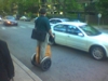 Friend of mine caught this fleeting glimpse of a real live Segway on the near north side of Chicago. Two observations: Although this fellow sprung for a $4,000 personal mobility system, he apparently feels compelled to steal cardboard boxes and wedge them betwixt his loafers.