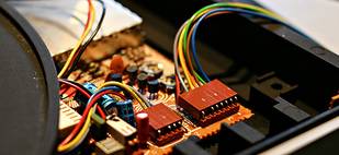 The main analog board of a record player I'm repairing. The motor has already been switched out from a donor (sent from England.)